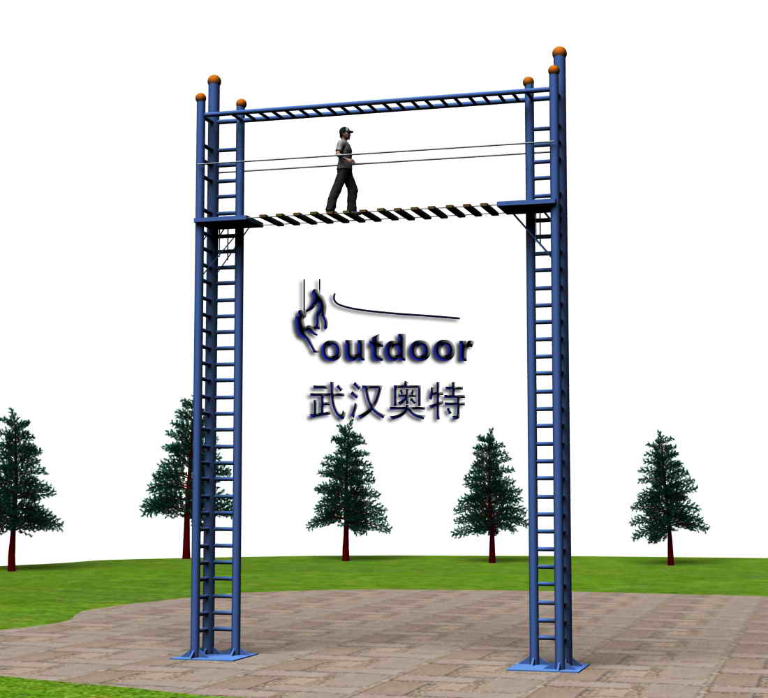 拓展設(shè)施產(chǎn)品介紹:參與者需要穿越高空中兩條鋼絲間稀缺的木板。
