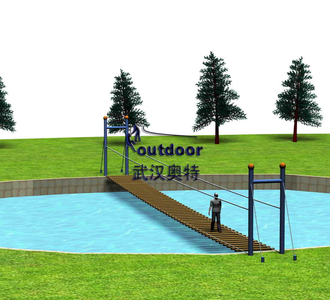 拓展設施產(chǎn)品介紹:參與者腳踏稀疏木板的橋面,小心慢行。