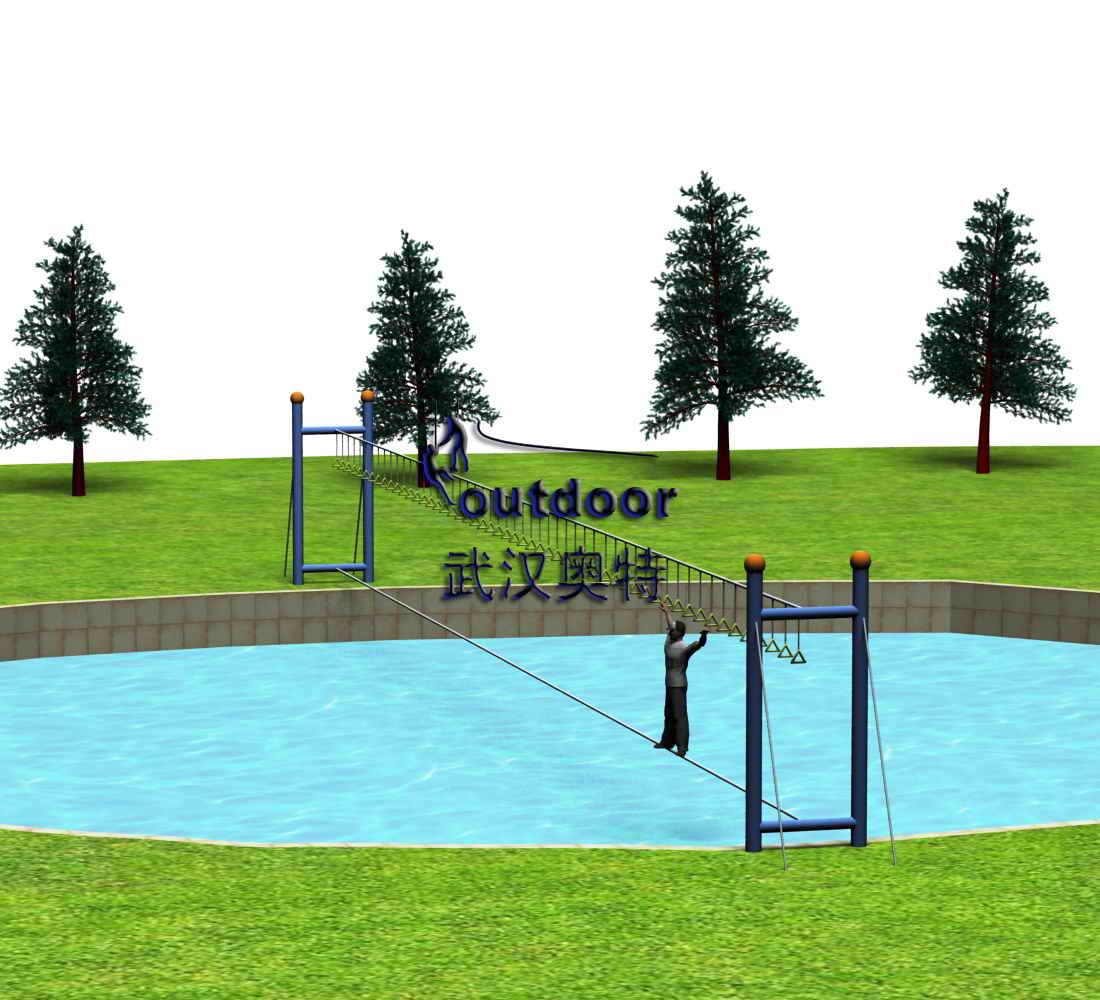 拓展設(shè)施品介紹:參與者腳踩鋼纜,雙手抓牢上方吊環(huán),穿越水上簡易的橋面