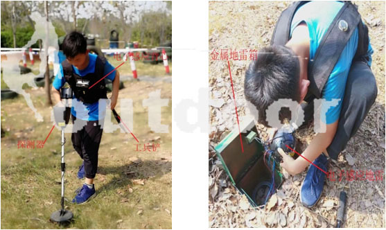 教官將隊伍分成敵我兩隊,先由一方在規定的時間內將自己的狗牌埋在雷區規定范圍內,對方通過探雷器避開地雷找尋狗牌,然后互換另一方埋,同樣通過避雷找到狗牌數量多的隊伍獲勝。