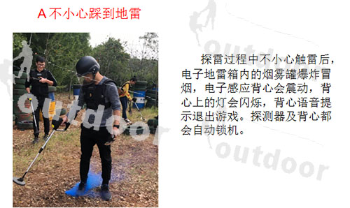 參與者身穿迷彩服,手持探測儀在特定的“雷區”訓練場地間穿梭奮戰,好比一場真實的戰斗給人帶來無比的刺激與成就感。“排雷兵”可以模擬爆炸及振動,隊員在觸雷陣亡后有振動、音響、燈光顯示,并且中央控制器可以同公共廣播及時播報陣亡人數及名單。時間、排雷難度等均可隨意設定,可以及時了解及控制團隊進程。